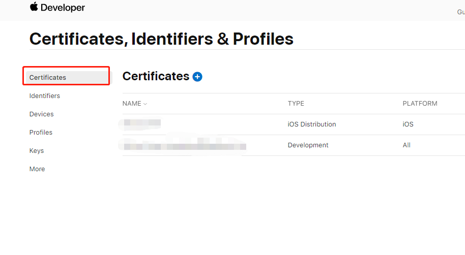 4、打开苹果开发者中心,点击certificates,点击蓝色小加号,创建证书,创建证书的时候无论测试还是app store打包,都要选ios distribution app store and adhoc,不要选apple和devel类型的证书。 因为ad hoc是真机测试类型,app store是发布appstore类型,在hbuilderx里云打包都是用发布证书,真机测试也属于发布证书。