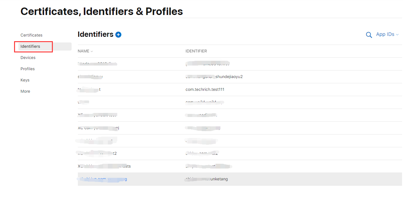 1、登录进入苹果开发者中心后台,点击Identifiers,添加App ID,这个App ID要跟你在开发工具编译的时候填写的包名一致,假如已经添加App ID,则跳过此步。