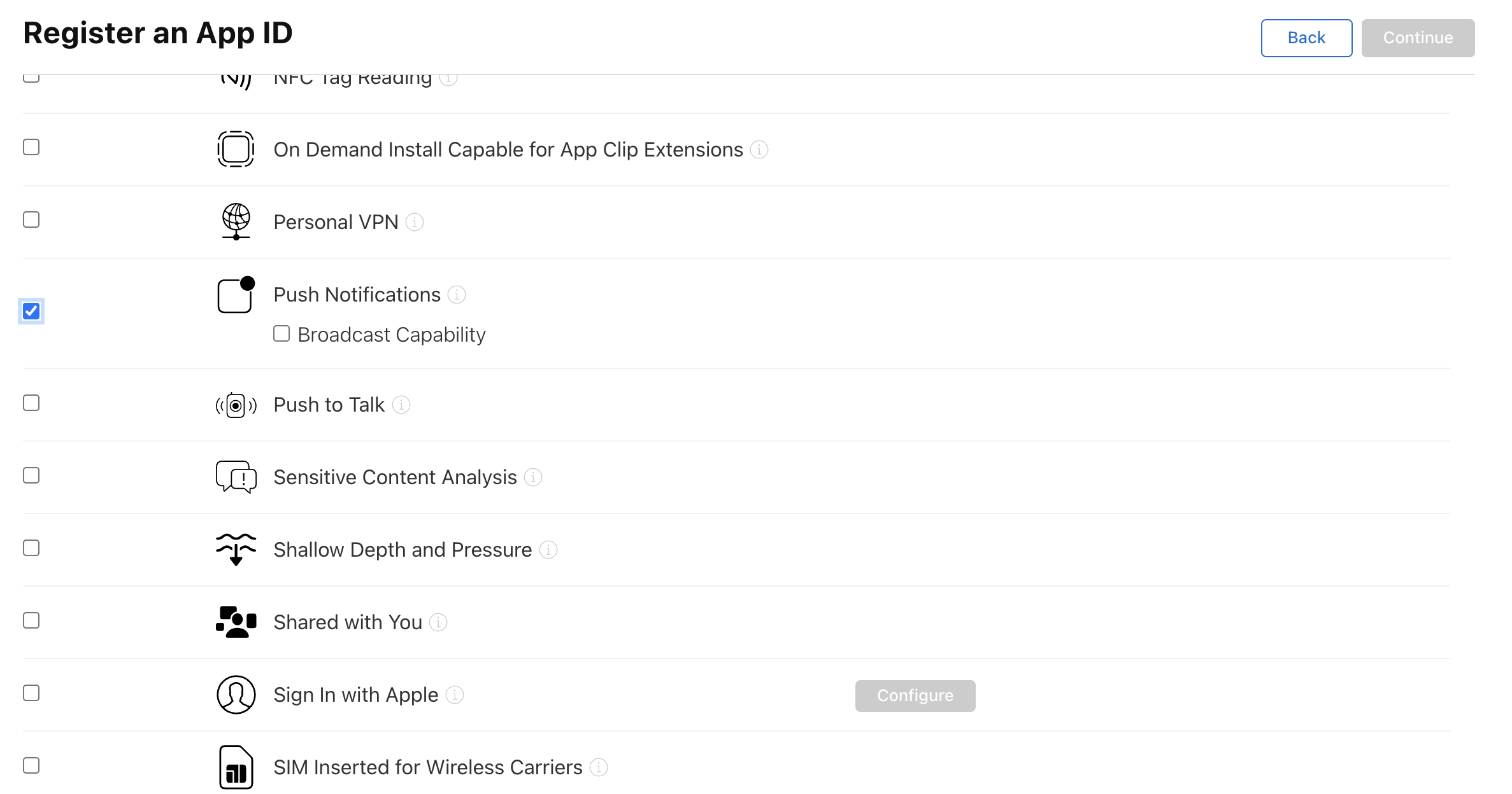 创建appId的过程中,有很多开发选项可以选择,比如假如你要使用推送功能,是需要勾选支持推送的,当然假如你不需要推送,就不要选支持推送,因为支持推送除了勾选这个选项外,还需要单独创建一个推送证书放到推送平台的,一般这些选项假如你没有使用的话,一般是不需要勾选的。如下图所示:
